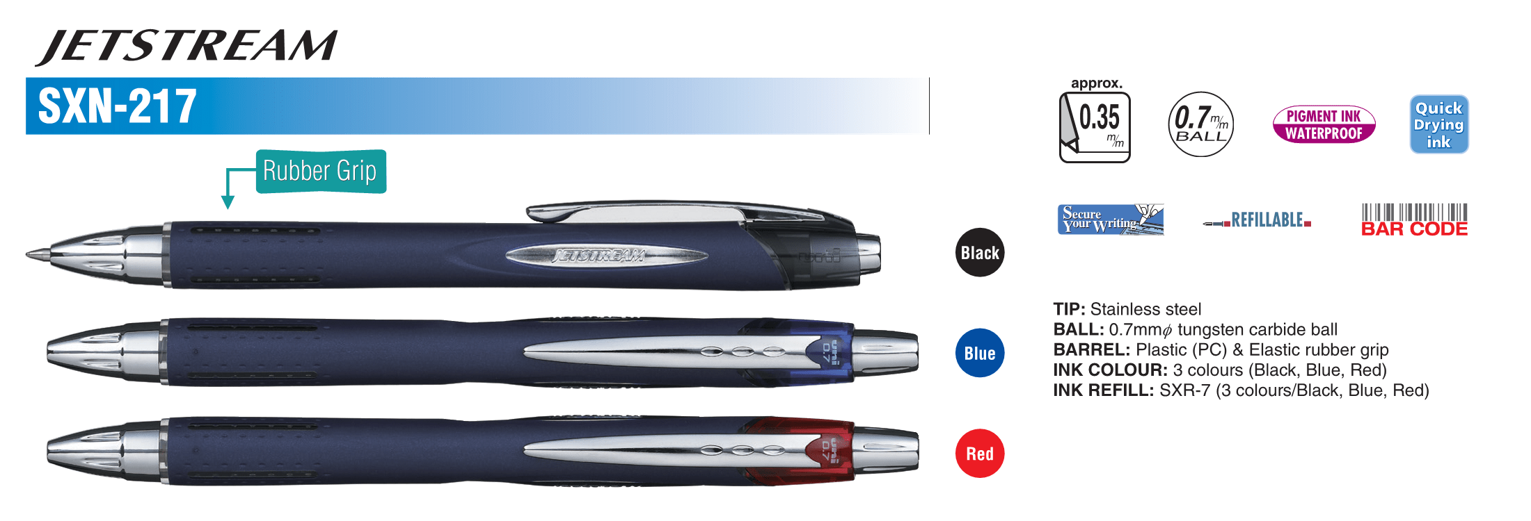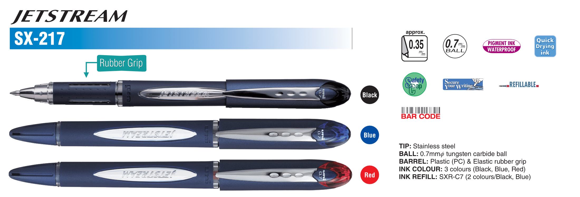 | 11 | Jetstream hybrid oil ink | Jetstream RT | SXN-217 | 0.7mm | 0.35mm | SXR-7 | Disappointing writing experience but yes, it has a fine stroke! The “RT” (retractable) has been dropped from the official name. The version with removable cap is SX-217. The 1.0mm models that write in 0.45 mm: SXN-210, SX-210. |