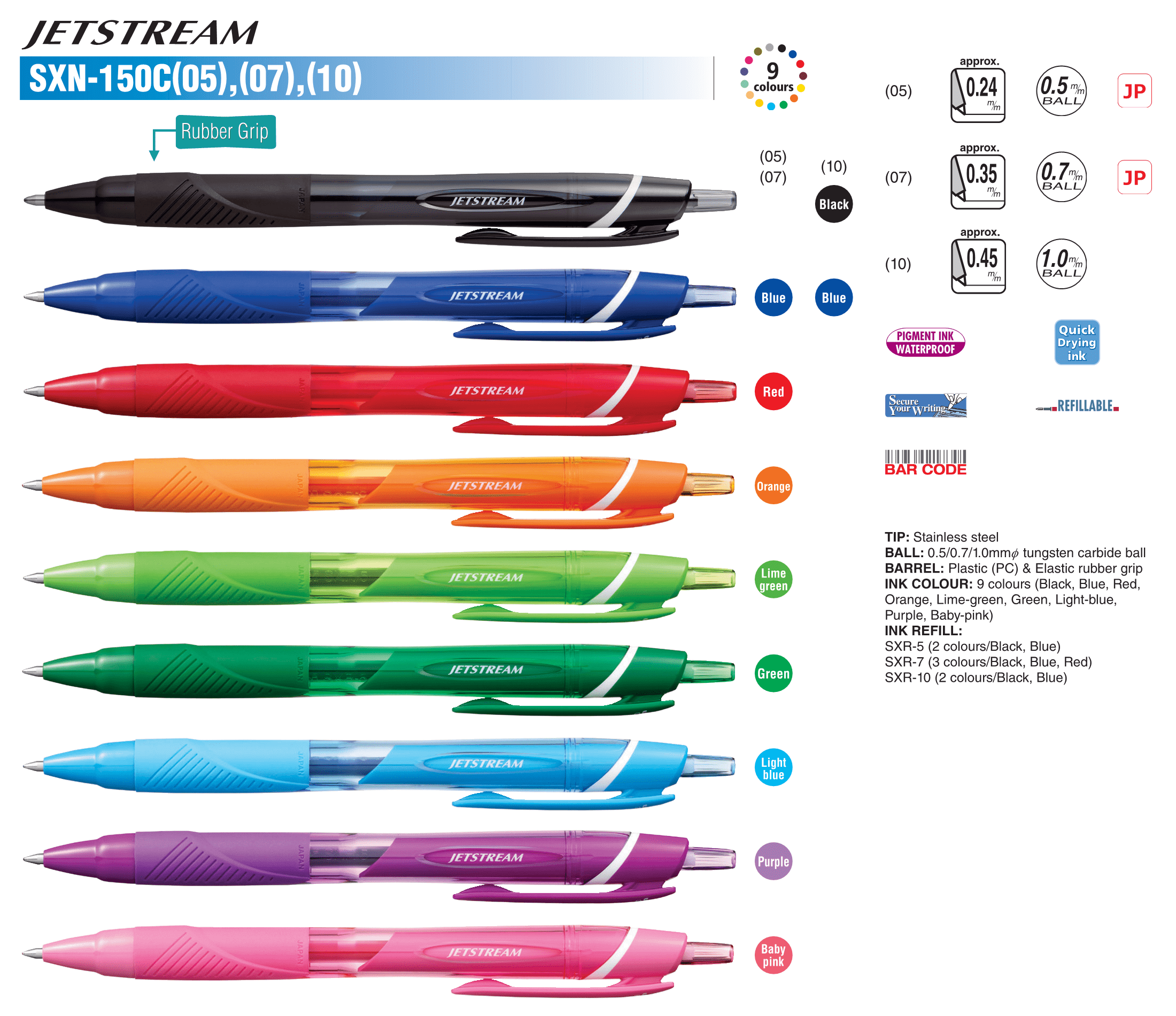 | 12 | Jetstream hybrid oil ink | Jetstream JP | SXN-150-07, SXN-150C-07 | 0.7mm | 0.35mm | SXR-7 | See above. Similar model: SXN-157S (“Sport”). Versions with codes ending in -10 and -05 have 1.0mm and 0.5mm balls and write in 0.45mm and 0.24mm. The “C” are available in 9 colors and made in the respective color. The “JP” in the catalog means “Manufactured in Japan from Japanese-made materials.” |