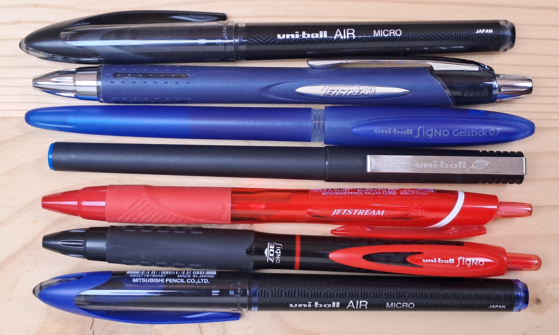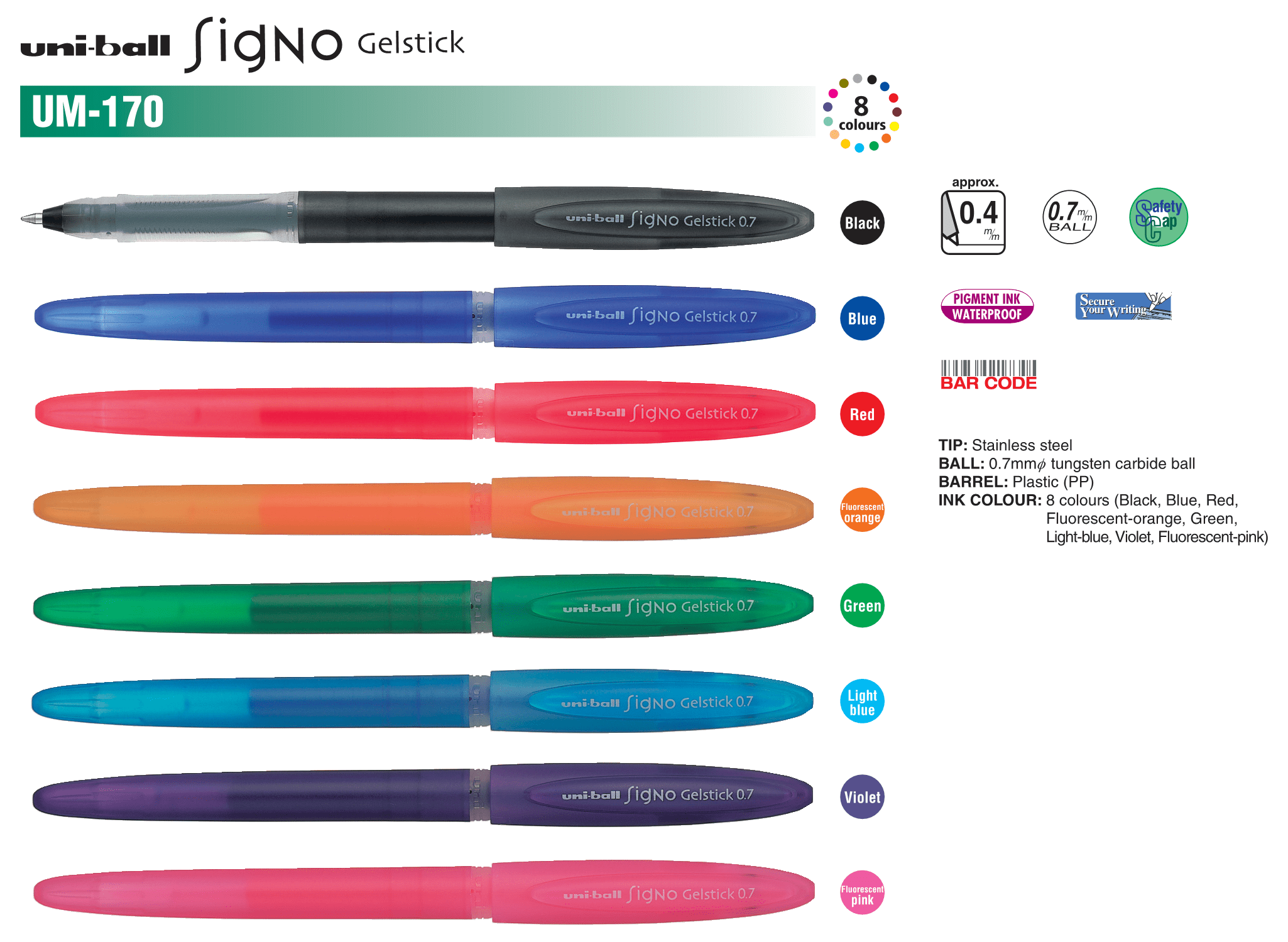 | 9 | Gel ink | Signo Gelstick | UM-170 | 0.7mm | 0.4mm | N/A | The cheapest plastic with the greatest writing! |