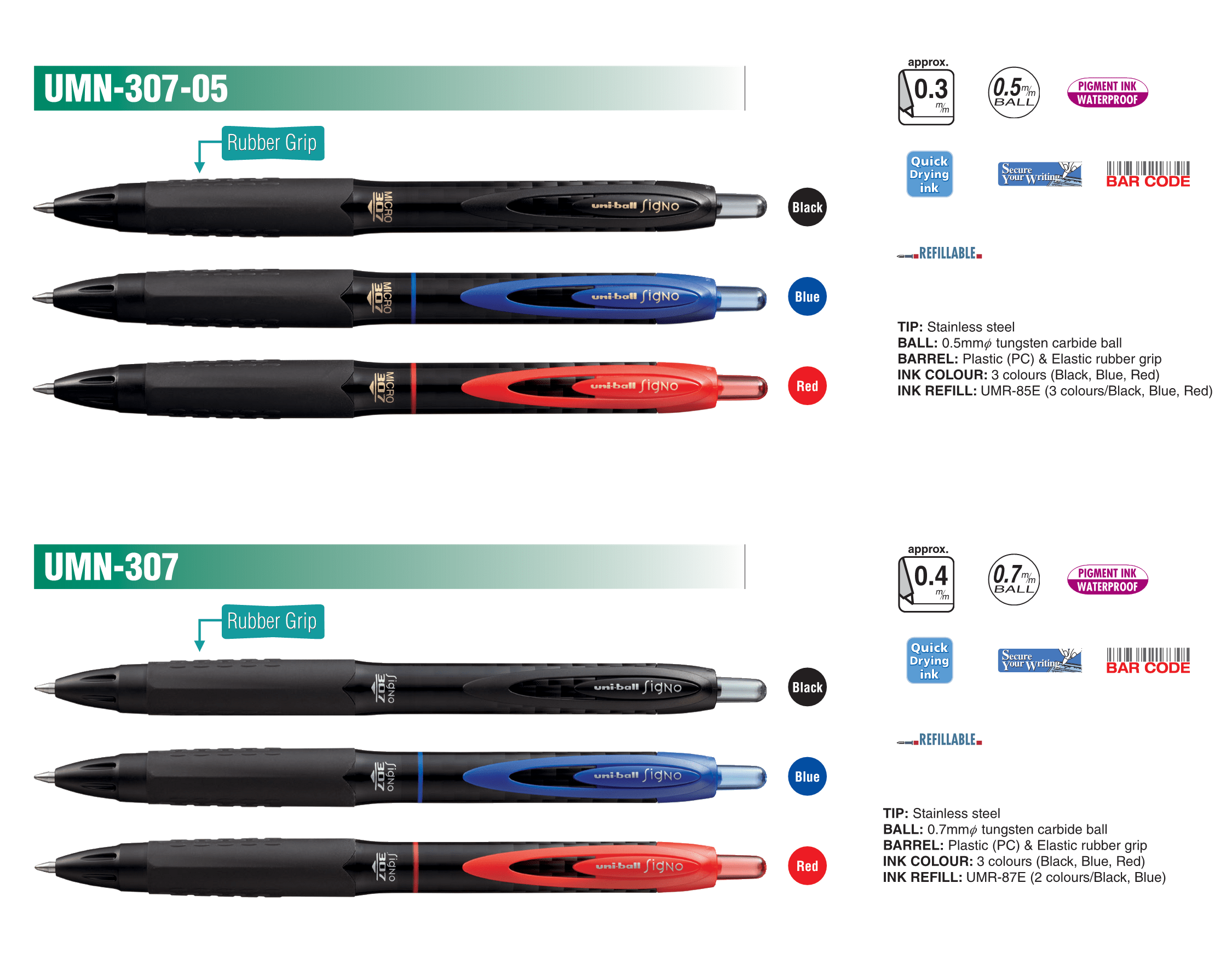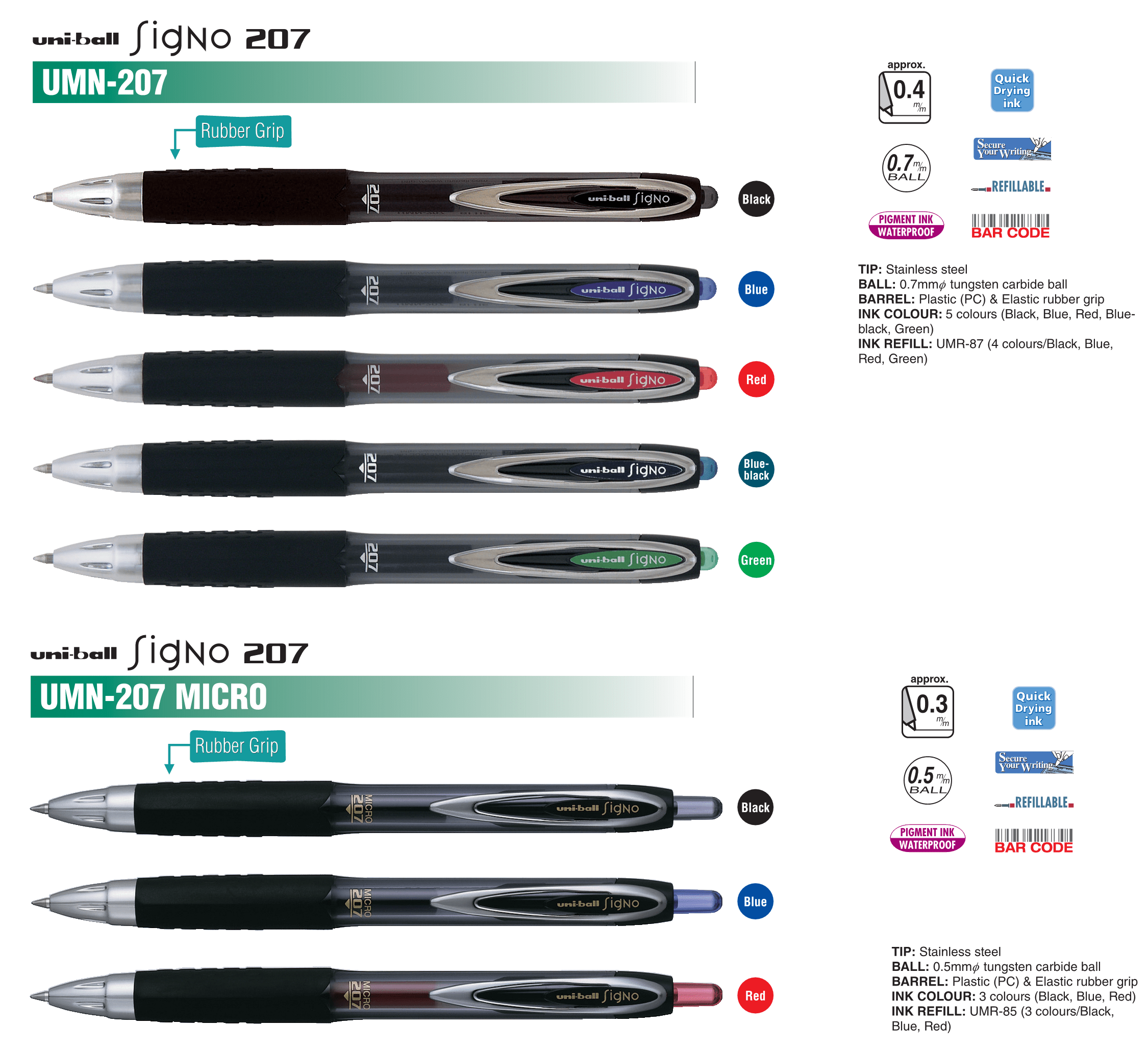 | 10 | Gel ink | Signo 307 | UMN-307 | 0.7mm | 0.4mm | UMR-87E | Premium build (the Signo 207 UMN-207 uses a different UMR-87 refill), great writing. I never tried the 0.5mm UMN-307-05 that writes in 0.3mm (equivalent to UMN-207 MICRO). |