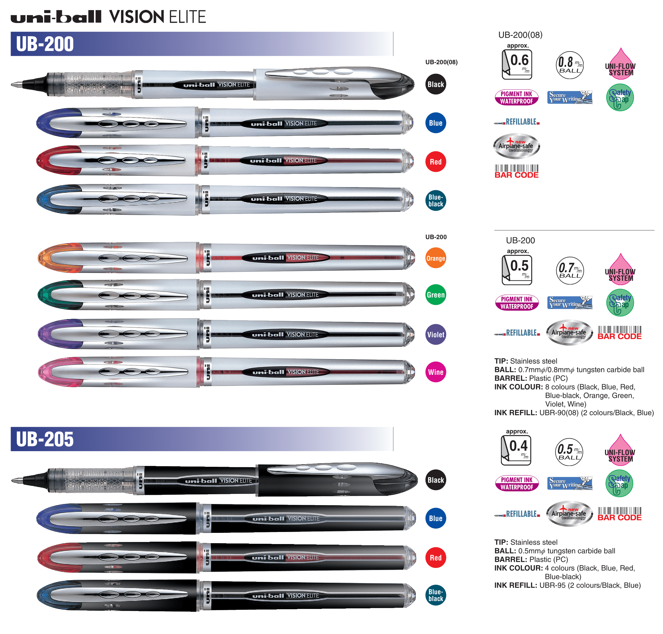 | 8 | Liquid ink | VISION ELITE | UB-205 | 0.5mm | 0.4mm | N/A | Prefer this one! The width is in the code, not in the name! |