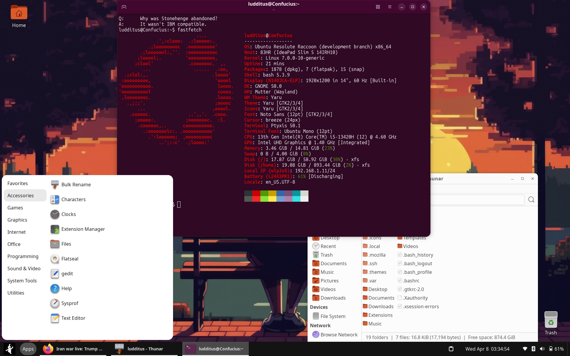 ubuntu-dock(a patcheddash-to-dockinstead of thegnome-shell-extension-ubuntu-dockpackage, as was the case before 26.04) andtiling-assistant(replacing thegnome-shell-extension-tiling-assistantpackage). - 5 Ubuntu-specific GNOME extensions:
