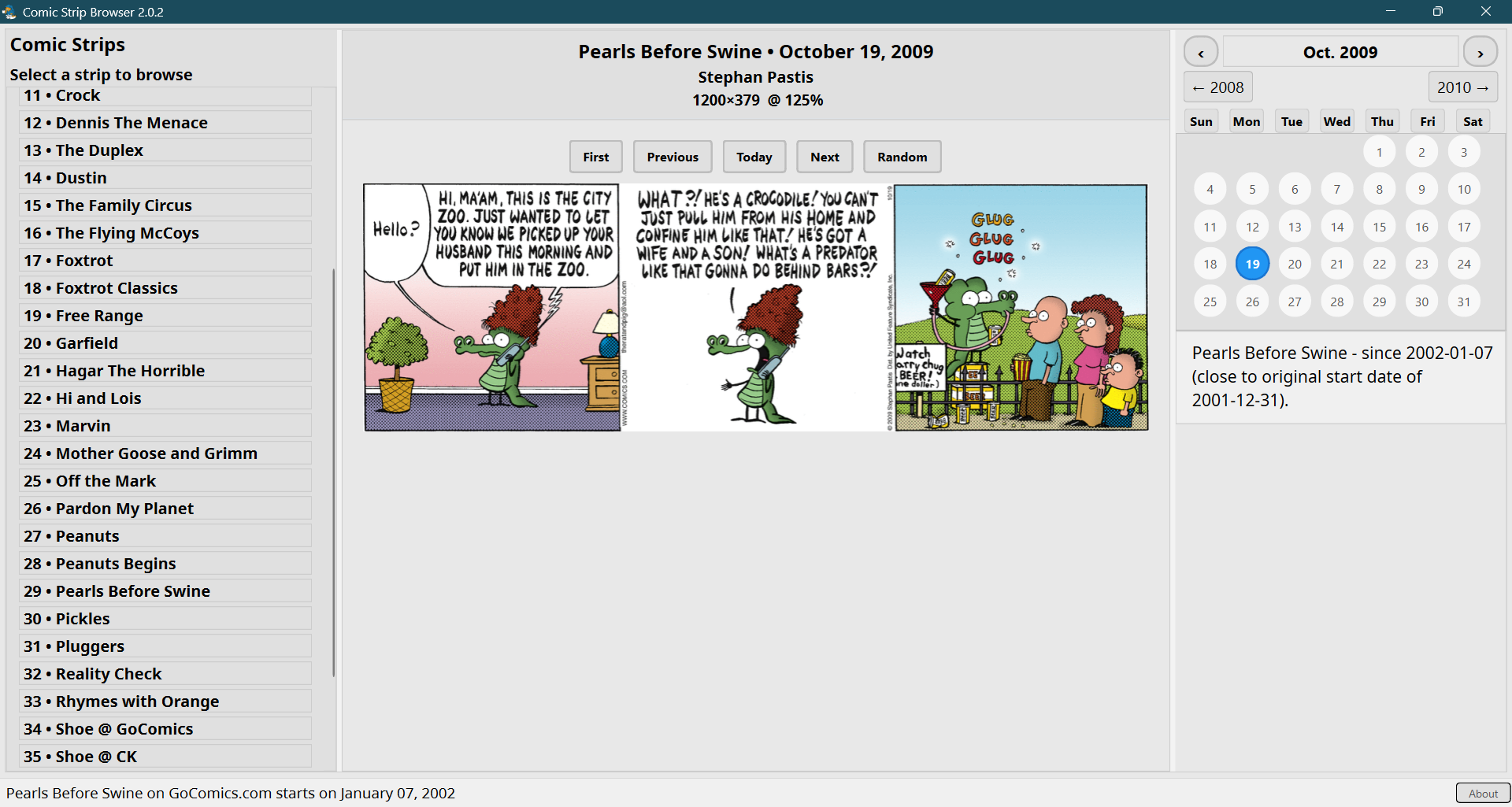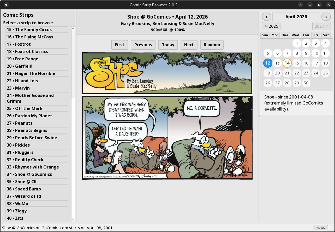 In the process, I made ComicStripBrowser retrieve from both GoComics and ComicsKingdom. The selection is limited to 40 titles, and the choice was made based on my taste.