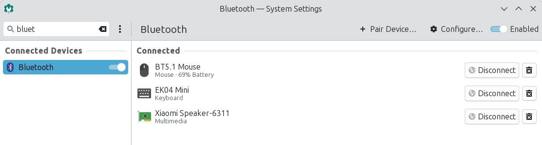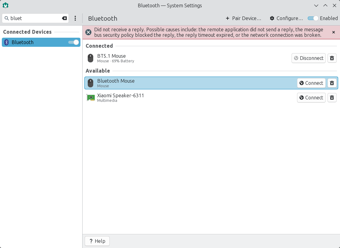 An unfixable issue I’m having with Kubuntu 26.04, which I also had with Ubuntu 26.04, is that on resuming from sleep, Bluetooth fails to restore to a correct state. As a result, it claims to have connected to the Bluetooth mouse, but the cursor doesn’t move. Even disconnecting isn’t possible, suggesting that it displays the last reported status from before the sleep, but Bluetooth is actually dead. The only fix is to reboot.