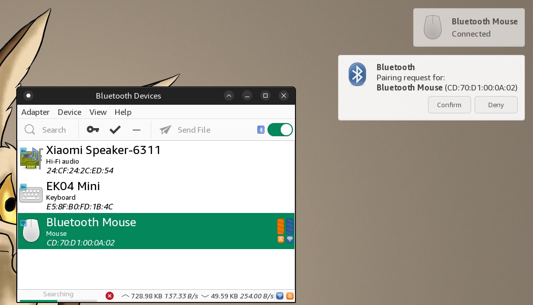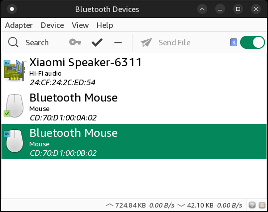 Even under XFCE, connecting to this mouse for the first time was sometimes fraught with misadventures. At times, a second mouse would simply materialize out of thin air! As you can see in the image, this doppelgänger sported the ID CD:70:D1:00:0B:02, right alongside the genuine and correct CD:70:D1:00:0A:02.