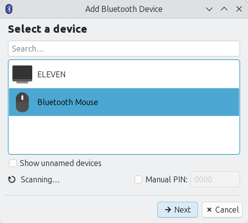 • Then, in the installed system, I couldn’t persuade Kubuntu to detect my mouse! Radio silence! Stealth mouse! No matter how long I waited with the mouse broadcasting in pairing mode, it didn’t show up in the Add Bluetooth DeviceSelect a Device window!