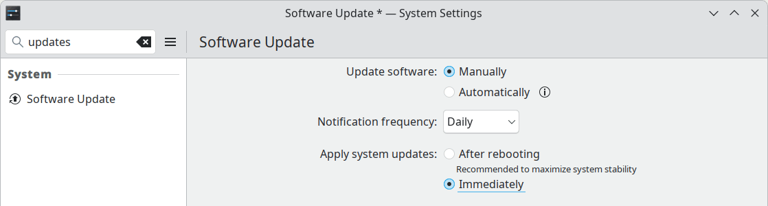 Then, guess what? There is an option to apply the system updates immediately, not after a reboot! It’s said to be, basically, the same as running sudo dnf upgrade in the terminal. Kernels are still updated after a reboot, though.